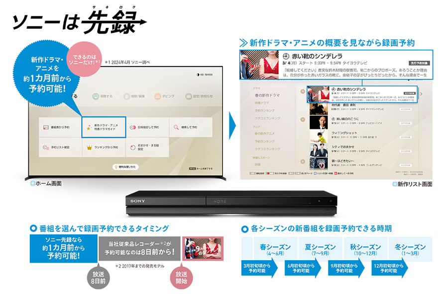 また、「新作ドラマ・アニメガイド」は、人気になりそうな注目の番組情報を1か月先行して確認できる機能。EPGでの番組予約は1週間前でないと予約できませんが、これを使うと1か月先からチェックできてしまいます。予約のし忘れを防ぎたい人には便利です。このように、録画予約のしやすさが大きな特徴となっています。