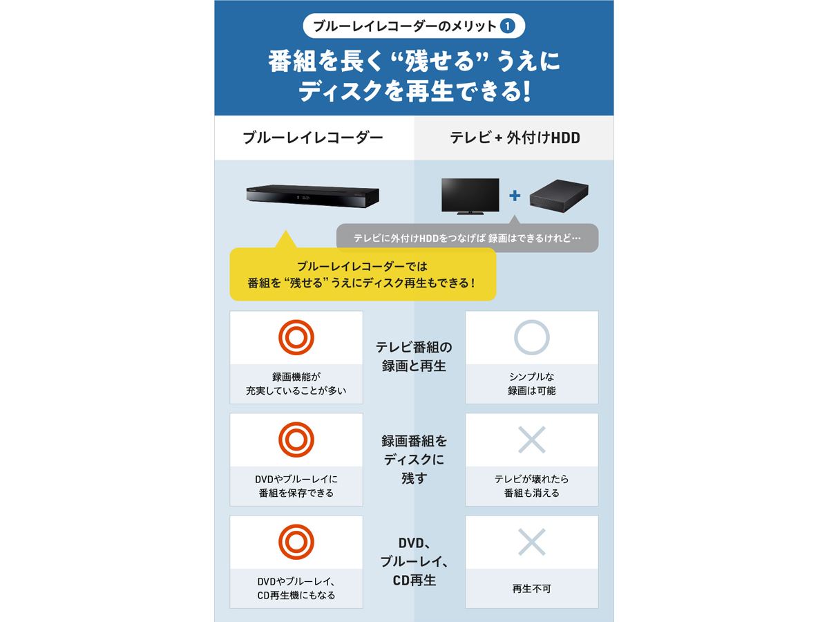 テレビでも録画はできますが、そのテレビを買い替えた場合、録画番組はもう見られません。ディスクに“残す”こと、ディスクを再生することを重視する人にブルーレイレコーダーはおすすめです。