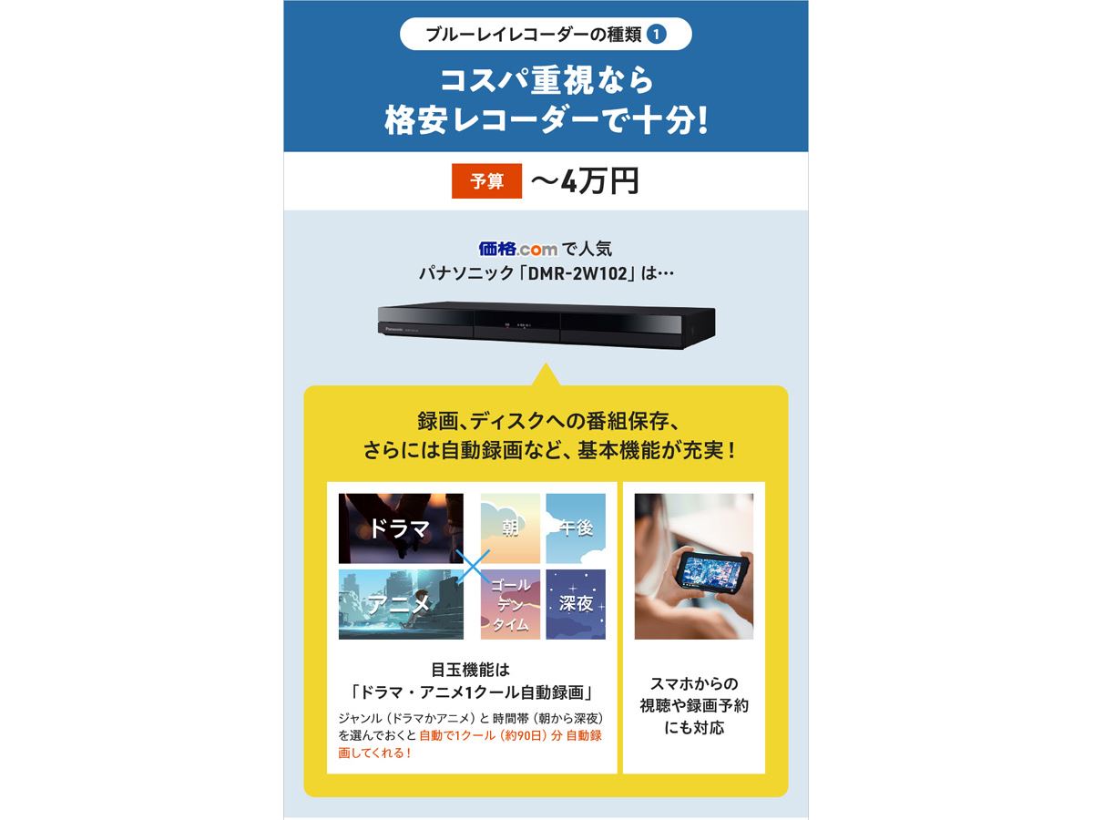 格安モデルであればブルーレイレコーダーは3万円台後半から購入可能です。こうした価格の製品でも実は基本機能は十分。価格.comで人気の製品は、パナソニックの「DMR-2W102」です。もう少し(3,000円程度)安い製品はありますが、発売日が新しく、機能が充実したこの製品が人気になることは当然と言えるでしょう。ここで数千円を渋ることはおすすめしません。数千円の違いが使い勝手に大きく影響する可能性があるからです。