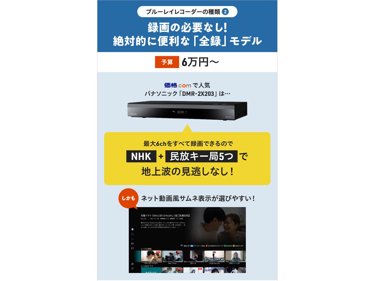 最低でも6万円前後と少し高価ですが、予算が許すのであれば「全録」対応製品がおすすめ。