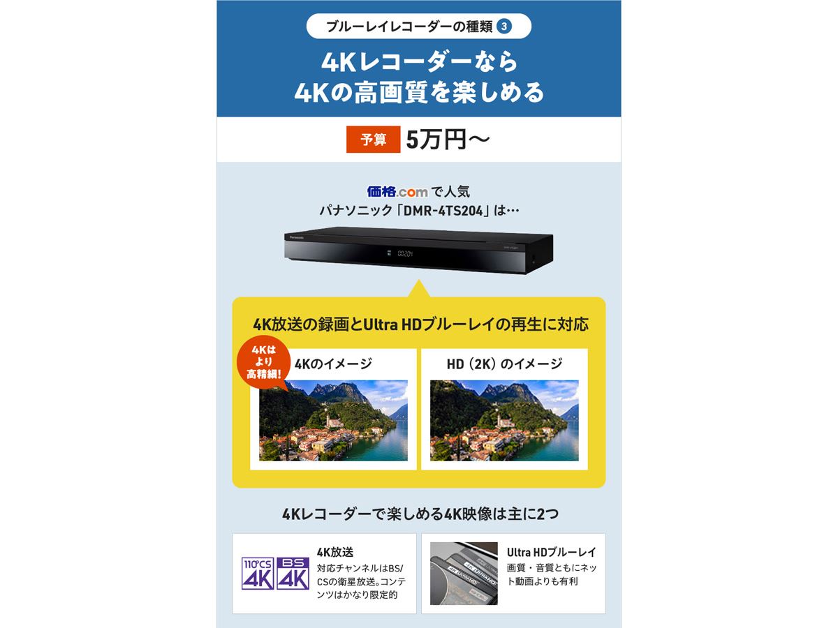 BS・CSの4K放送を録画したい人、4K解像度の映像を楽しめるUltra HDブルーレイを再生したい人は「4Kレコーダー」がおすすめ。4K放送の受信(視聴)と録画、Ultra HDブルーレイの再生が可能です。