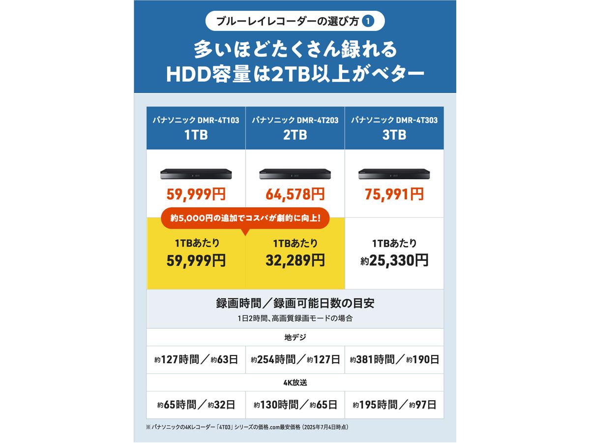 ただし、2025年9月26日時点での価格.com最安価格は6万円を超えています。パナソニックの4Kレコーダー「DMR-4TS204」や「全録」対応レコーダー「DMR-2X203」も選択肢になる価格ですから、この点も含めて検討するとよいでしょう。