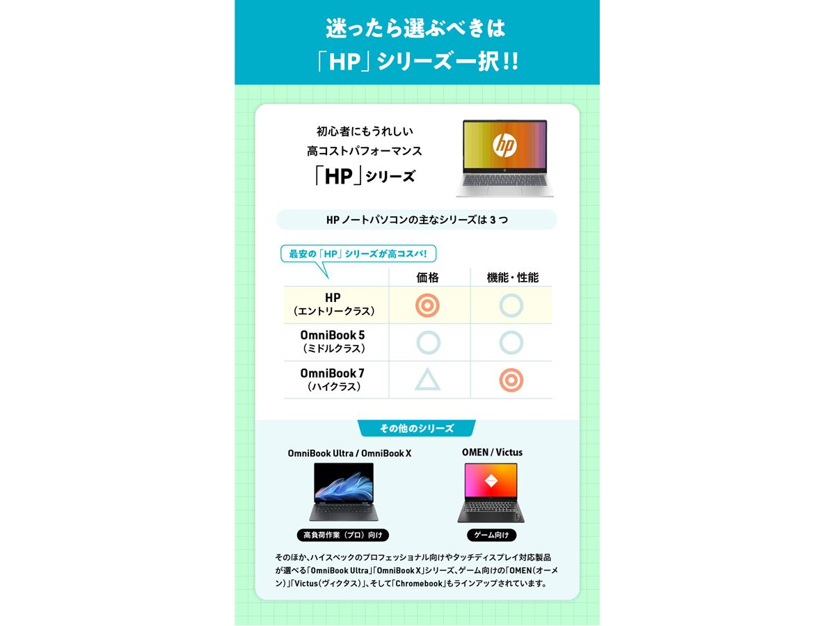 ここで特に注目すべきは、最安のエントリークラス「HP」シリーズです。動画編集など、ノートパソコンに負荷がかかる作業をしたい場合は「OmniBook(オムニブック)5」や「OmniBook 7」シリーズが候補になりますが、「HP」シリーズのスペックは、事務作業やウェブサイト閲覧には十分すぎるほど。最もコストパフォーマンスにすぐれたシリーズだと言えるでしょう。