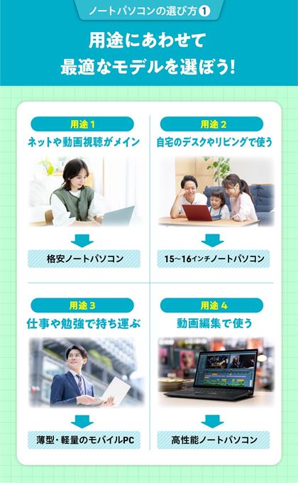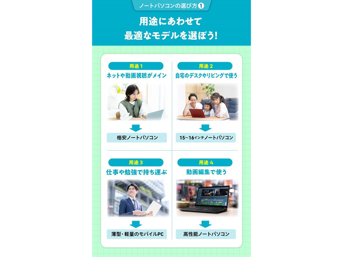 ノートパソコンは性能が高いものほど高価になります。性能が高ければ万能に使えますが、ネット検索や動画視聴など普段使いのために高性能は必要ありません。そこで、用途を大きく4つに分け、自分に合ったモデルを考えてみましょう。