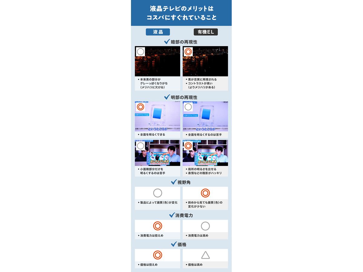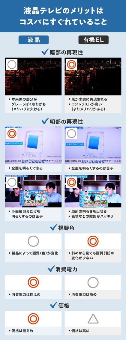 画質だけで言えば有機ELテレビが有利ですが、それは主に「部屋を暗くして」「映画を見る」ときに発揮されるもの。そういったケースがないのであれば、コストパフォーマンスにすぐれた液晶テレビを選択肢にするとよいでしょう。