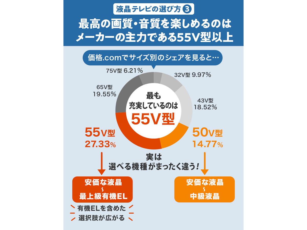 メーカーが力を入れているのは55V型と65V型。最高画質・音質のテレビを求めるならば55V型以上のサイズを選ぶ必要があります