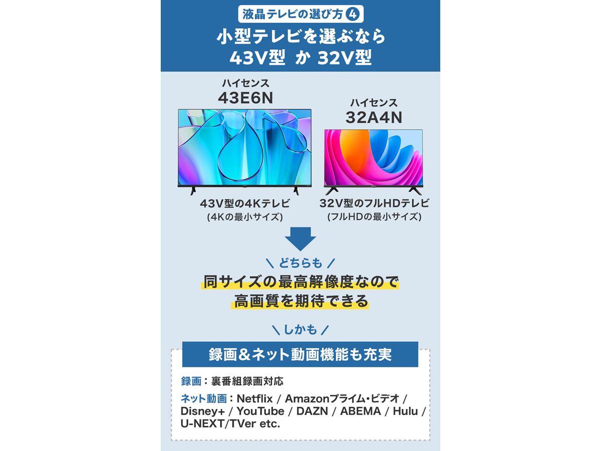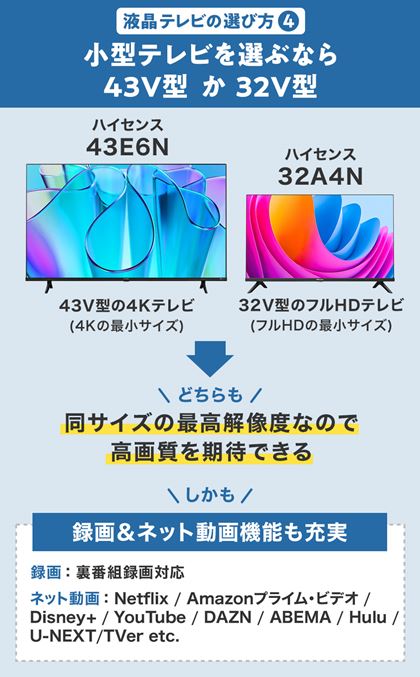 また、テレビのサイズが小さくても、録画やネット動画の再生機能など、できることには大きな差がないことがほとんど。価格を抑えたいという場合にも、4Kならば43V型、フルHDならば32V型がそれぞれ狙い目のサイズと言えます。