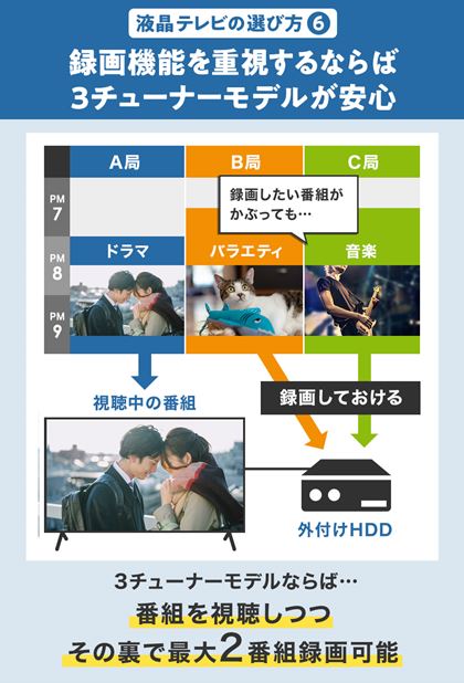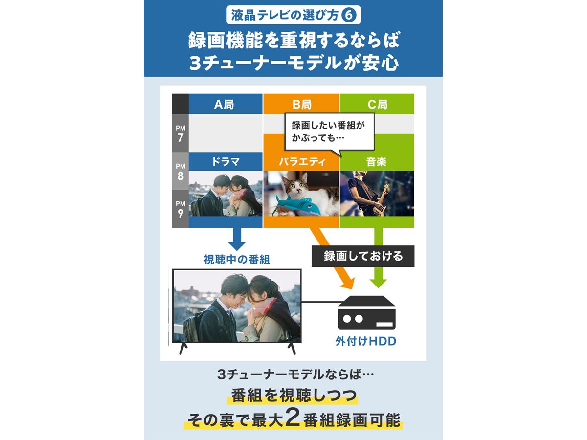 DVD・ブルーレイレコーダーを使わずに録画機能を充実させたい場合は、3チューナーを搭載したテレビがおすすめ。3チューナーのテレビならば、テレビと外付けHDDを接続するだけで2番組の同時録画(と同時の別番組視聴)が可能。録画したい番組が重なる場合でも困ることがありません。