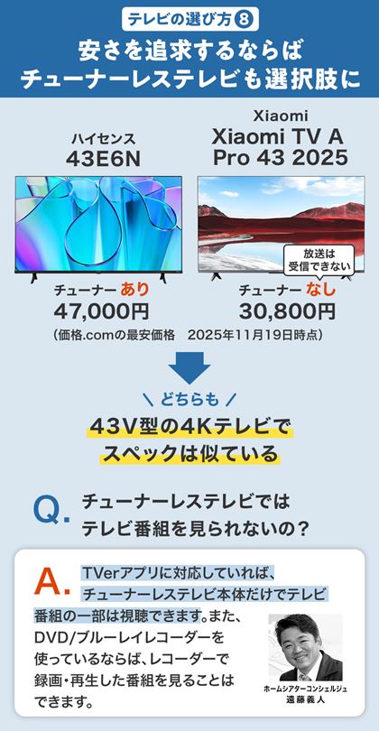 その大きな理由は、42V型以上の最新テレビは、基本的にすべて4K解像度だから。あえて旧モデルなどの低解像度のテレビを選ぶ必要はありませんし、低解像度の大型テレビが安いということもありません。また、4K放送を見ないのであれば、専用アンテナの設置は不要です。