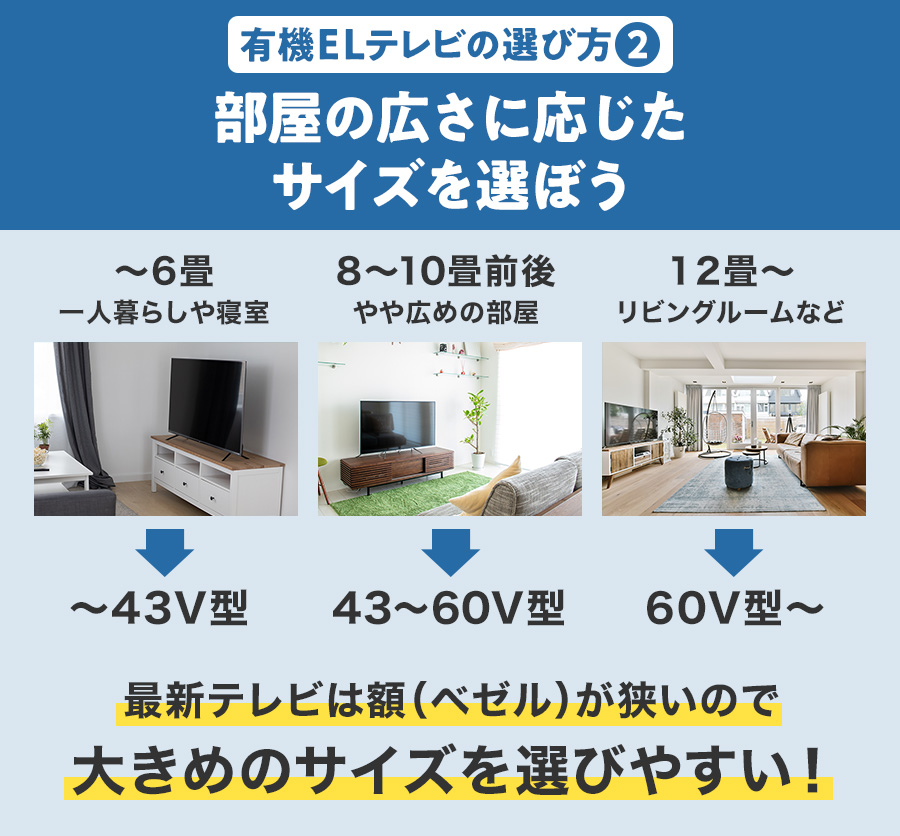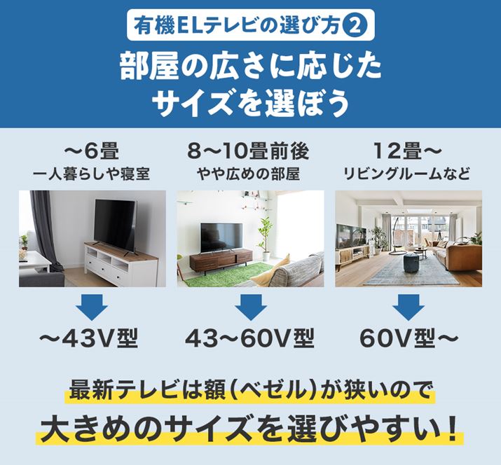 最新のテレビは画面周辺の額(ベゼル)が細くなっており、とても省スペース。もし10年ほど前のテレビからの買い替えならば、思っていたよりも大きなサイズが候補になるはずです。このことは液晶テレビ・有機ELテレビで共通しています。