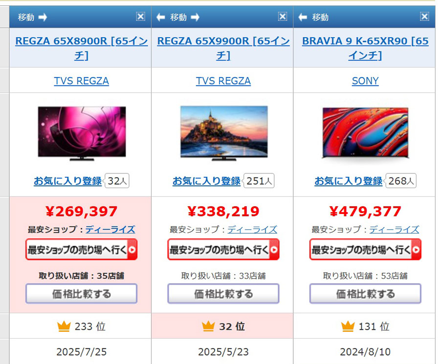 2025年11月13日時点の価格.com最安価格を比較。同サイズで比べるとTVS REGZAの最高級有機ELテレビ「65X9900R」よりもソニーの液晶テレビ「K-65XR90」のほうが高価でした