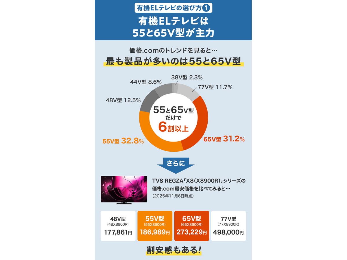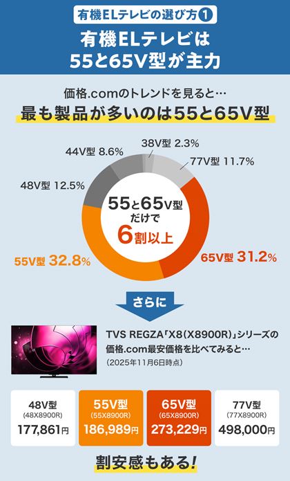 ボリュームゾーンは55と65V型。77V型以上は極端に高価になるため、コストパフォーマンスがよいとは言えません。有機ELテレビの高画質をどうしても77V型以上の大画面で楽しみたい、と考える強い動機がある人向けの高級品です。