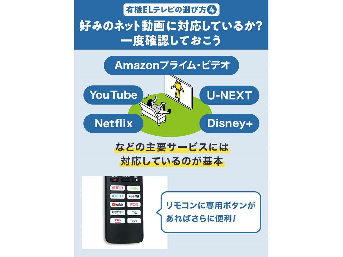 上記3つはすべての製品が対応していると思って間違いありませんが、TVerやDAZNなどに対応しているかどうかは製品次第。リモコンにショートカットボタンを搭載していることもあるので、自分が利用するサービスに対応しているかどうか、リモコンにボタンがあるかどうか、確認するとよいでしょう。