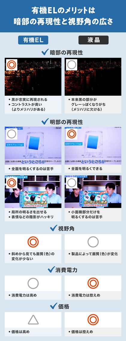 上記のとおり、価格で言えば有機ELテレビよりも一般的な液晶テレビのほうが有利です。それでは有機ELテレビは「コストパフォーマンスが悪い」テレビなのでしょうか? もちろん、そうではありません。有機ELテレビには高級液晶テレビでも実現できない表現力があるからです。パフォーマンスが上がる分、価格も高くなりがち、ということは覚えておきたいポイントです。