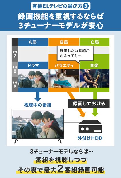DVD・ブルーレイレコーダーを使わずに録画機能を充実させたい場合は、3チューナーを搭載したテレビがおすすめ。3チューナーのテレビならば、テレビと外付けHDDを接続するだけで2番組の同時録画(と同時の別番組視聴)が可能。録画したい番組が重なる場合でも困ることがありません。