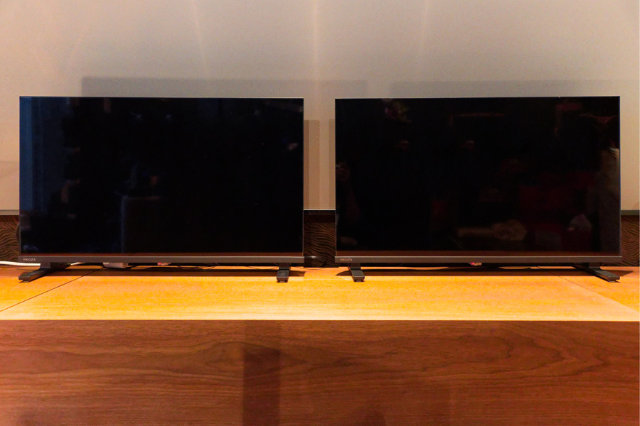 「32V35S」(右)に加えて、同じくフルHD解像度の弟モデル「32S25S」(左)も用意。両機種の差を通じて「32V35S」の魅力を浮き彫りにする