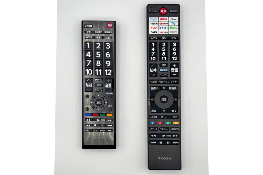 両機のリモコンは大きく異なる。左の「32S25S」はよくある従来型で、右の「32V35S」はさらに上位モデルに近い形。「32V35S」のリモコンには主要ネット動画サービスにダイレクトでアクセスできるボタンが配置されている