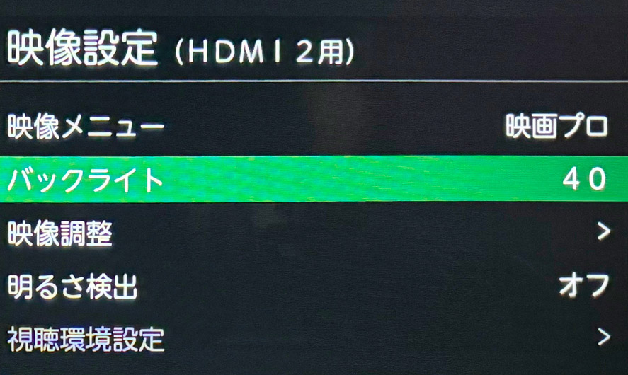 映画を見るときは「映像設定」から「映像メニュー」を確認してみるとよい。暗めの部屋で映画を見るためのメニューは「映画プロ」だ