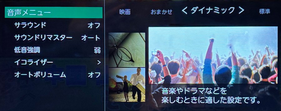 なお、「音声メニュー」の初期値は「ダイナミック」だった。メリハリを付ける方向のチューニングだが、個人的には「おまかせ」か「標準」に固定してしまうのがよいと思う。このどちらでもアナウンサーのナレーションや映画のセリフがやや上ずっているが、妙にキンついたりすることなく、持てる素材を最大限生かしたうえで破綻なく処理している印象だった。