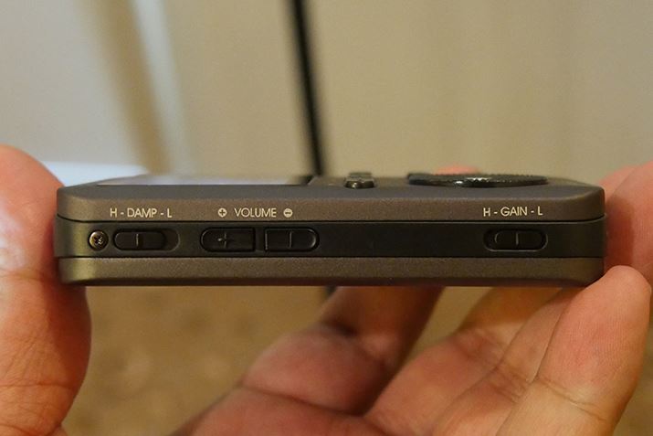 側面には、ヘッドホンやイヤホンに応じてインピーダンスを「Hi/Low」に切り替えることができる「GAIN」スイッチ、カップリングコンデンサーの有り無しを切り替えできる「DAMP」スイッチ、ボリューム調整スイッチを備えている