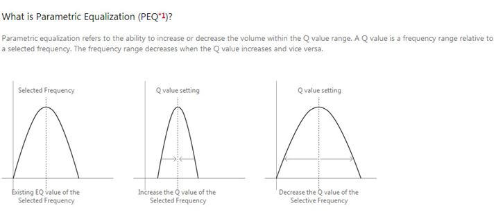 PEQのQ値の設定イメージ。Q値を低くすると基準となる周波数を中心に広い範囲でEQを掛けられるようになり、逆にQ値を高くするとその範囲を絞れるようになる
