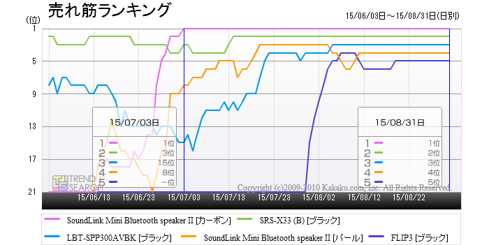 「Bluetoothスピーカー」カテゴリーにおける売れ筋上位5製品のランキング推移
