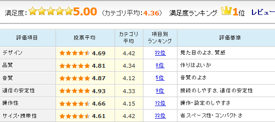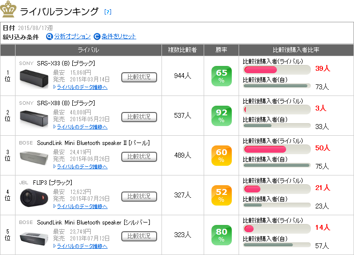 上の図は、本製品とよく購入比較をされるライバル製品を表した「ライバルランキング」で、図中の「勝率」は、比較された結果、本製品がどれだけの確率で選ばれたかを示している。これを見ると、本製品はライバル5製品に52〜92%の高い勝率で勝ち越している。特に価格的には1万円程度安いソニー「SRS-X33 (B) 」に65%の確率で勝ち越している点は大きい。売れ筋、満足度とも好調な本製品だが、製品競争力もかなり高いと言えそうだ。他のライバル製品の追随を許さない本製品の人気だが、現在の独走状態がいつまで続くのか注目される。