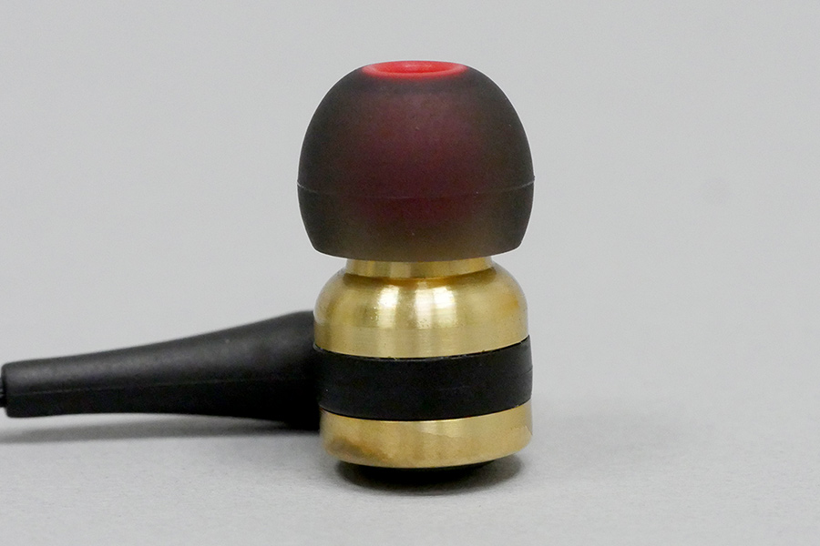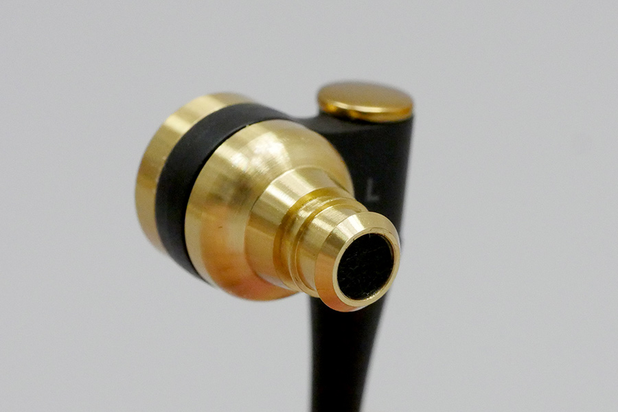 まず、EHP-CH1000の外観からチェックしていこう。メタルハウジングを採用し、材質は剛性の高い真鍮(黄銅)製だ。重量は約9g(コード含まず)で、ハウジングを手に持つと確かな重みを感じることができる。この金属ならではの重みと強度が、余計な振動を抑え、共振を防ぐというのだ。ハウジングの真ん中にはリング状の樹脂素材があり、そこでハウジングのノズル側と背面側がつながっているような構造になっている。
