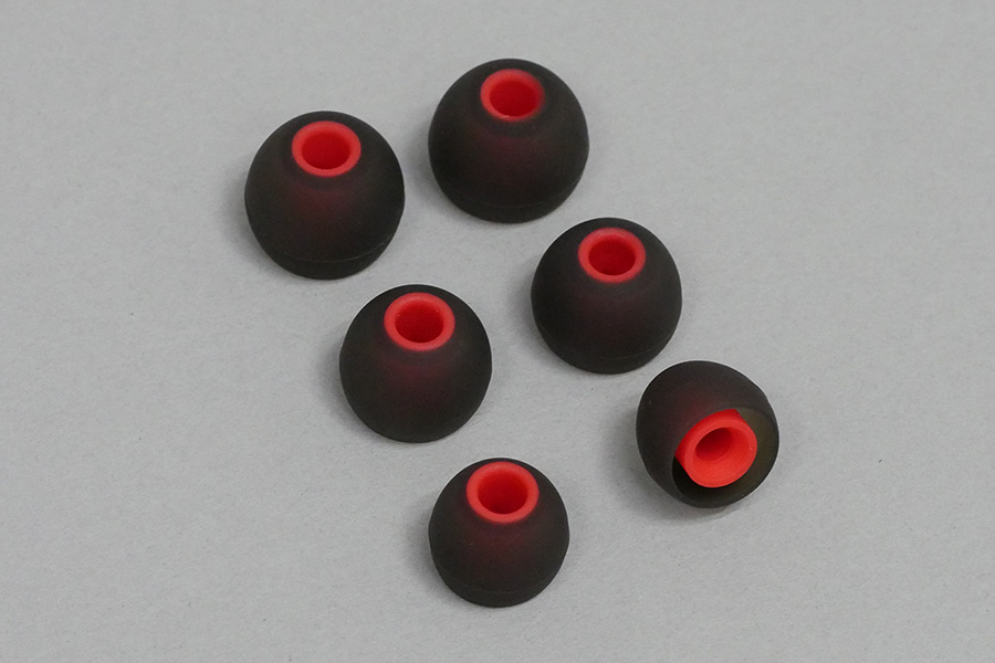 前述の通り、EHP-CH1000は、低価格イヤホンの中では重めのハウジングだが、それに反して大きさはやや小ぶり。そのため、実際に装着してみると、重心の偏りが小さく、耳へのおさまりがよいと感じた。重さのわりに長時間着けていても疲れることはないと思う。フィット感と密閉性を高めるために、イヤーキャップの硬さを内外で変えるなどの工夫により、着け心地自体も良好だ。イヤーキャップはS/M/Lの3種類。いずれもラバータイプだ。