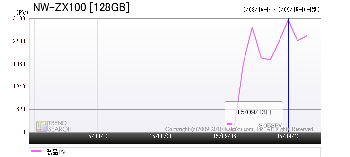 「価格.comトレンドサーチ」で見ると、「MP3プレーヤー」カテゴリーにおける注目ランキングでは、本製品「NW-ZX100[128GB]」は、9月8日の製品発表から3日目の9月11日に早くも4位にランクイン。9月15日には2位まで上昇した。売れ筋ランキングでも、9月16日に10位にランクインしている。製品詳細ページへのアクセス数も、9月13日に3,053PV/日を記録。発売に向けてさらにアクセス数を伸ばしそうだ。なお、本製品の9月15日時点での最安価格(予約販売価格)は、製品発表時の72,230円より1,130円安い71,100円だった。