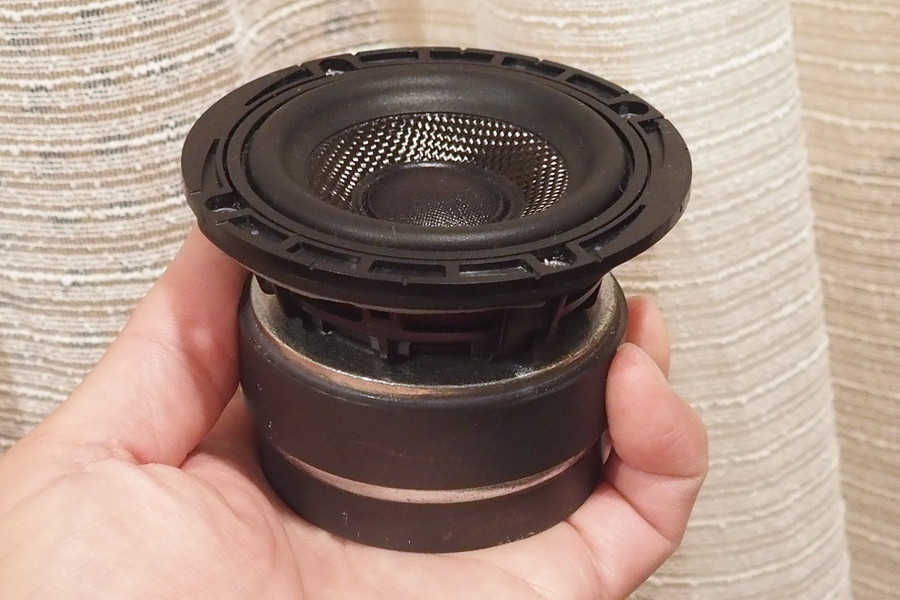 ウーハーは62mm径ユニットで、振動板には、軽量で高剛性なカーボンファイバーコーンを採用。フレームに、あえて樹脂の比重を高めたモールドフレームを採用することで、ユニットの振動をしっかりと受け止められるようになっている。さらに、銅リング&銅キャップを採用することで、ボイスコイル動作時に発生するコイルのインダクタンスの増減を抑制。非対称の歪みを減らすようになっている。