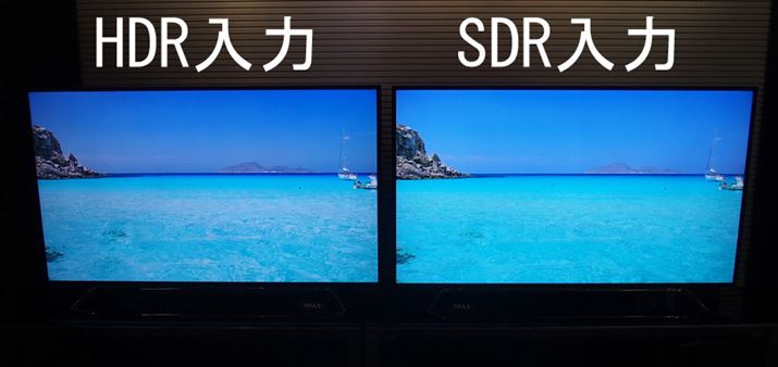 HDR入力では海面のハイライト部の階調が出ているが、SDR入力はそれがつぶれている。写真ではうまく再現できなかったが、実際のSDR入力の映像は抜けが悪く、色がくすんでみえた