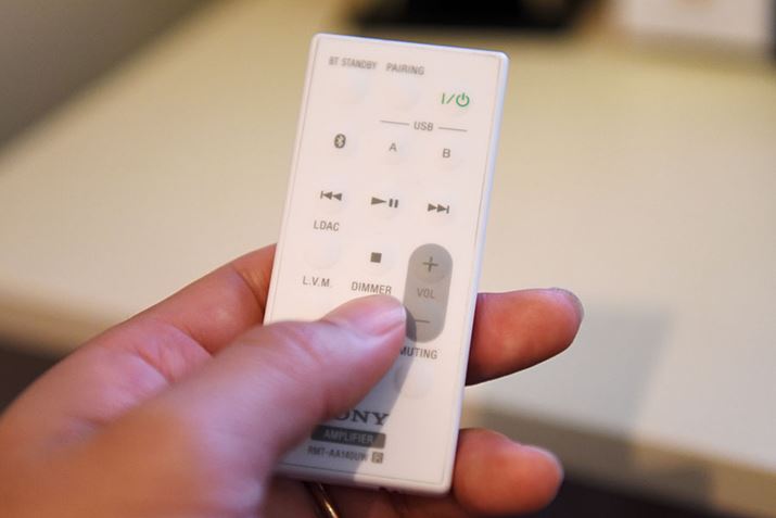 付属リモコンからの操作が可能。入力切り替えやボリューム調整、「ローボリュームモード」のオン・オフなどが可能です