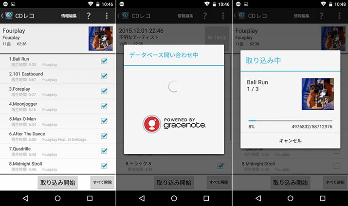 Android端末で音楽CDのリッピングを行うには、専用アプリ「CDレコ」(無料)を利用する。ルーター経由であれば、音楽CDの楽曲情報をインターネットから取得可能だ。楽曲情報が充実しているGracenoteが使えるのはメリットだ