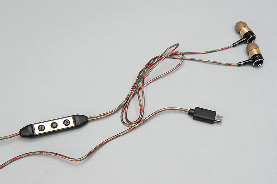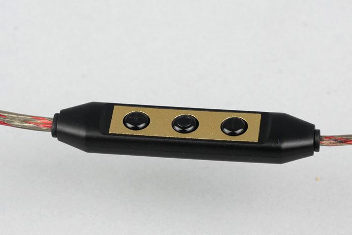 DACとヘッドホンアンプはともにWolfson製。ケーブルの分岐手前に備え付けられた、小型のコントロールボックスに収められている。3つのボタンが用意されており、ボリュームのアップ/ダウン、再生/一時停止、曲送り/戻しが操作できる。また、ケーブルもユニーク。半透明なシースに、赤のスパイラル模様が入っており、見栄えするデザインだ。