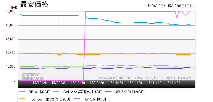 このように、発売から好スタートを切った形の「DP-X1」であるが、本製品はハイレゾ対応のオーディオプレーヤーとしても決して安い価格帯の製品ではないということだ。図5は、本製品を含む、「MP3プレーヤー」カテゴリーにおける人気5製品の最安価格の推移を示したものだが、この5製品の中では、本製品「DP-X1」がもっとも高く、75,000円台をほぼずっとキープしている。最大のライバル製品と目されるソニーの高級モデル「NW-ZX-100」でも、今や6万円台前半であることを考えるとかなり高めだ。もちろん、ハイレゾ対応の音楽プレーヤーには10万円をゆうに超えるような高級製品もあるが、これらは一部のマニア層向けの製品であり、広く流通するようなオーディオプレーヤーとしては、本機はかなりの高額製品ということになるだろう。なお、このほかの3製品は、価格帯は15,000〜30,000円ほどと安いが、ハイレゾ再生には対応していない。