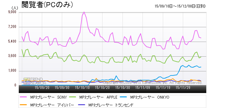 図3:「MP3プレーヤー」カテゴリーにおける人気5製品のアクセス推移(3か月)