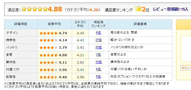 驚くべきなのは、これだけの高額製品でありながら、驚異的とも言える高評価をユーザーから受けていることだ。2015年12月9日時点の、本機「DP-X1」に寄せられたユーザーレビューを見ると、5点満点で4.88(レビュワー15人)というかなりの高評価(カテゴリー2位)を付けている。ほぼ満点に近い評価であるが、細かい項目でも「音質」が4.88(カテゴリー3位)、「拡張性」が4.40(同5位)、「デザイン」が4.40(同6位)、「付属ソフト」が3.41(同8位)と、軒並み高い評価をつけている。「携帯性」と「バッテリ」の評価は平均以下となっているが、それ以外の項目は高めの評価と言っていい。