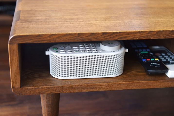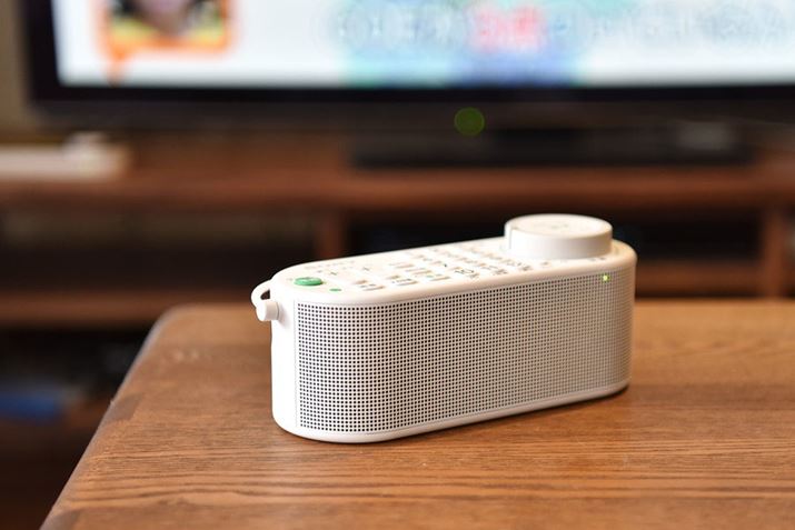 製品は送信機とスピーカー本体で構成され、テレビの音は、テレビの音声出力(ヘッドホン端子、もしくは光デジタル)に接続した送信機からスピーカーに無線で伝送される。無線が届く距離(スペック上は直線見通しで約30m)であれば、リビングのテーブルやキッチンなど、テレビ本体から離れたところにスピーカーを置いて、その場所でテレビの音を聞くことができる。また、スピーカーには防滴機能(JIS IPX2相当)が備わっているので、キッチンでも安心して利用できる。さらに、スピーカーがテレビリモコン一体型のデザインになっているのも特徴。テレビの電源のオン・オフや、音量調整、チャンネル変更、入力切り替えといった、テレビ本体の操作をひととおり行える。