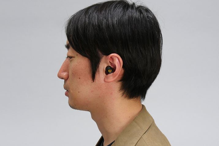 EARINの最大の特徴は、超軽量・超小型で、世界最小クラスのBluetooth接続のワイヤレスイヤホンであること。本体サイズは20×14.5mmで、重量はなんと約3.5g。というと1円玉4枚に満たない重さだ。耳に装着している様子はまるで、大きめの耳栓と見間違えるような形となっている。また、圧倒的にコンパクトであるため、胸ポケットにいれてもじゃまにならない。