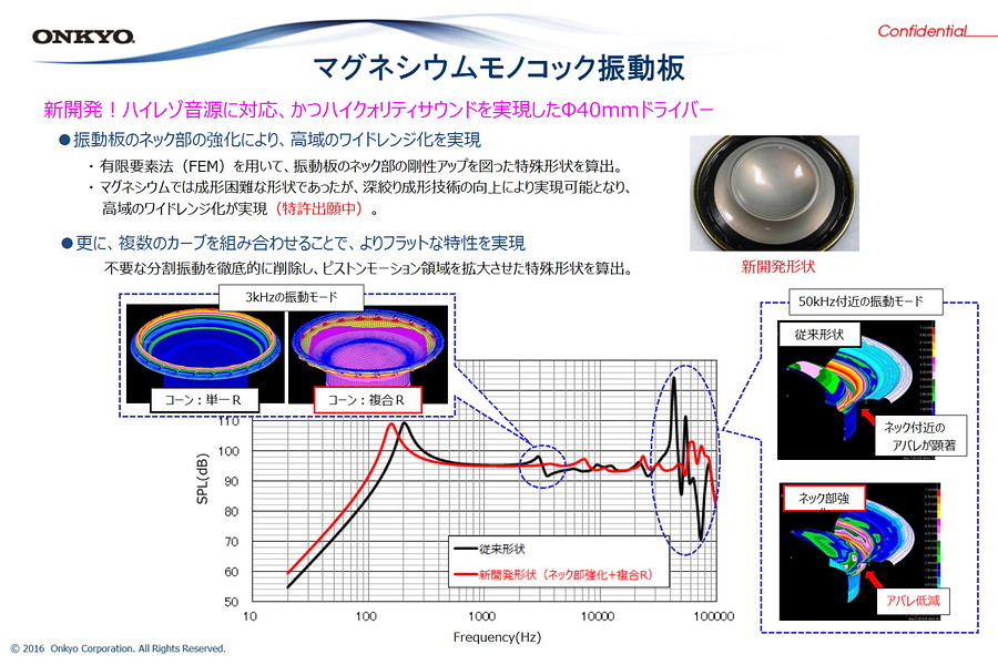 オンキヨーのハイレゾ対応ポータブルプレーヤー「DP-X1」で各種のハイレゾ音源を再生。金属らしい音が聴こえるのかと思いきや、これがいい意味で普通。金属製の振動板でありがちな硬さや歪みを感じさせないのだ。開発を担当した「藤谷氏」によると、これは、マグネシウムが持つ内部損失の高さに加え、振動板形状においても、シミュレーション技術を駆使することで不要な分割振動を徹底的に排除し、ピストンモーション領域を拡大させた結果だとのこと(振動板形状として特許出願中)。