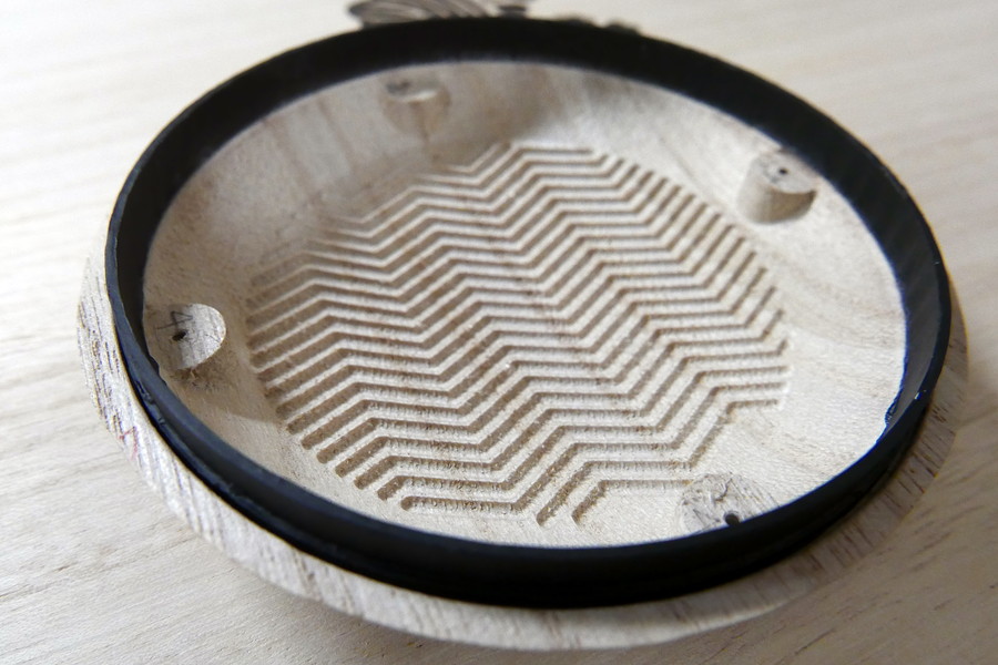 試作品筐体の内側。木の繊維を断ち切るように「綾杉彫」が施されている。