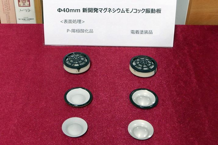 マグネシウムモノコック振動板。直径は40mmで、表面の耐蝕加工が異なる2種類を開発。左側はP-陽極酸化品で表面に艶がない。右側は電着塗装品で表面に艶がある