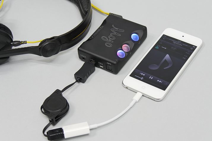 今回、Lightningアダプターを使ってMojoの音質をチェックした。試聴環境は、プレーヤーがA8チップ搭載の第6世代iPod touch(16GBモデル)で、イヤホンは1964EARSの6ドライバー搭載カスタムインイヤーモニター「V6 Stage」を使用。プレーヤーはオンキヨーの高音質再生アプリ「HF Player」で、イコライザーとアップサンプリングはオフにしている。なお、Lightning to USB Camera AdapterとLightningアダプターどちらを使っても音質について違いはない。間に高級なオーディオ用USBケーブルを使えば別かもしれないが、基本的には同じだ。