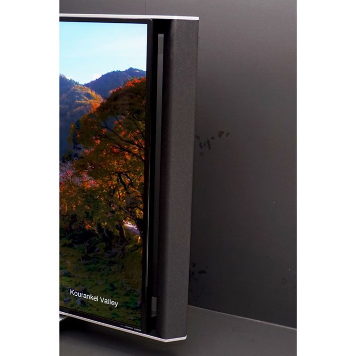 さらに新モデルでは、オンキヨーとの共同開発による高音質設計を採用し、サウンド面も大幅に強化している。特に上位モデルの「XD45」は、本体の両サイドに大型のスピーカーを配置した「AROUND SPEAKER SYSTEM」を搭載。通常のスピーカー配置とは異なり、2つのミッドレンジスピーカーユニットを上下に対向配置した独自構造により、リビングのような画面を囲むようなシーンで画面正面だけでなく、ある程度視聴角度のある場所でも自然なサウンドを楽しめるようになっている。