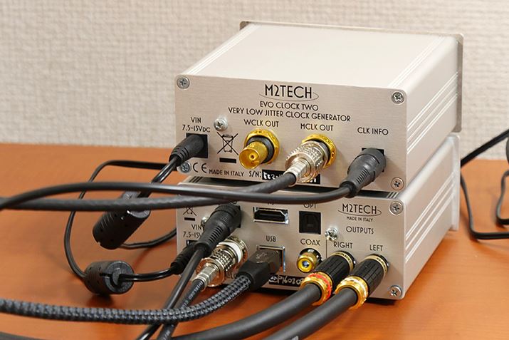 「Evo DAC Two Plus!」に「Evo Clock Two」を接続したときの背面の様子。ケーブルが硬く太めのタイプだと本体が動いてしまうことも