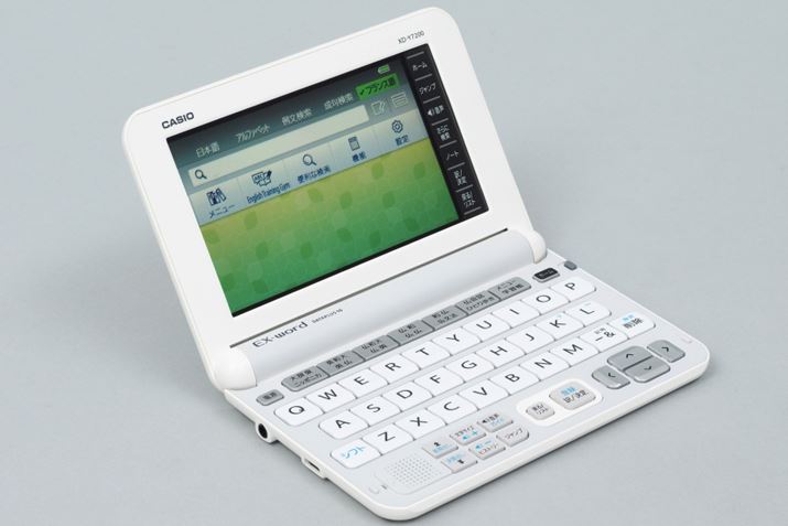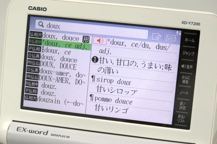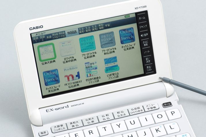 そこで一念発起! 本気でフランス語を学ぼうと決心し手に入れたのが、このカシオの電子辞書「エクスワード XD-Y7200」(以下XD-Y7200)。これ、フランス語学習に特化した電子辞書で、フランス語系の辞書や参考書が11コンテンツ収録されているのです! フランス語が堪能な上司に「フランス語学習にまず何が必要か」とたずねたところ、「つねに辞書を持て!」という回答。努力もせず自然に語学力が身に付くわけがわりません。……当然ですね。
