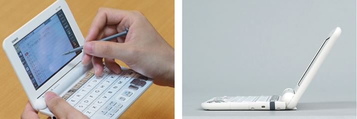 サイズは、148.0(幅)×105.5(奥行)×15.7(高さ)mm(閉時/最薄部)。重量は、約265g(電池込み)。液晶モニターはカラーで、5.3型タッチパネルを採用。手書き入力にも対応。スピーカー/マイク機能も搭載(ヘッドホン端子あり)