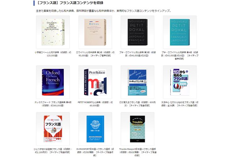 辞書のほか「口が覚えるフランス語」「ゼロから始めるフランス語」「ひとり歩きの会話集フランス語」「Dr.PASSPORT 日本語→フランス語版」「Trouble Passport 日本語→フランス語版」も収録。いずれもネイティブ音声収録