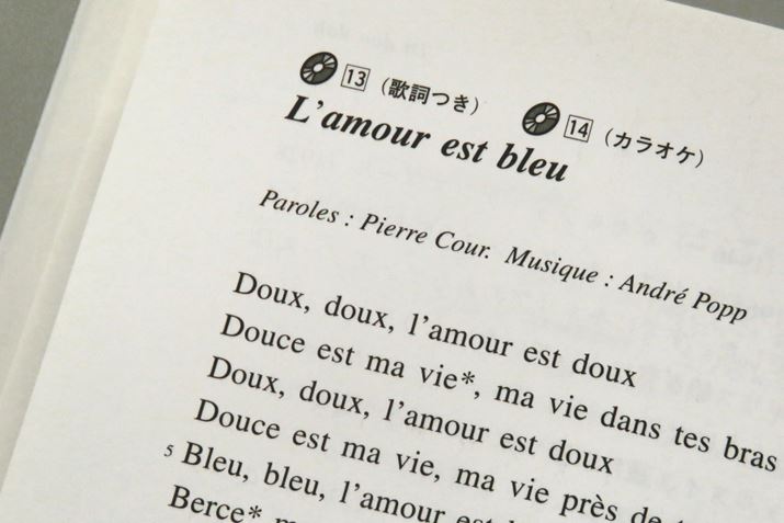単語を調べます。これは、大好きな60年代のヒット曲「恋は水色」(邦題)の歌詞。ドゥー、ドゥー、ラムーエドゥー♪と音だけの記憶はあるものの、出だしの「Doux」から意味がわかりません(「シャンソンで覚えるフランス語-2」(第三書房)より)